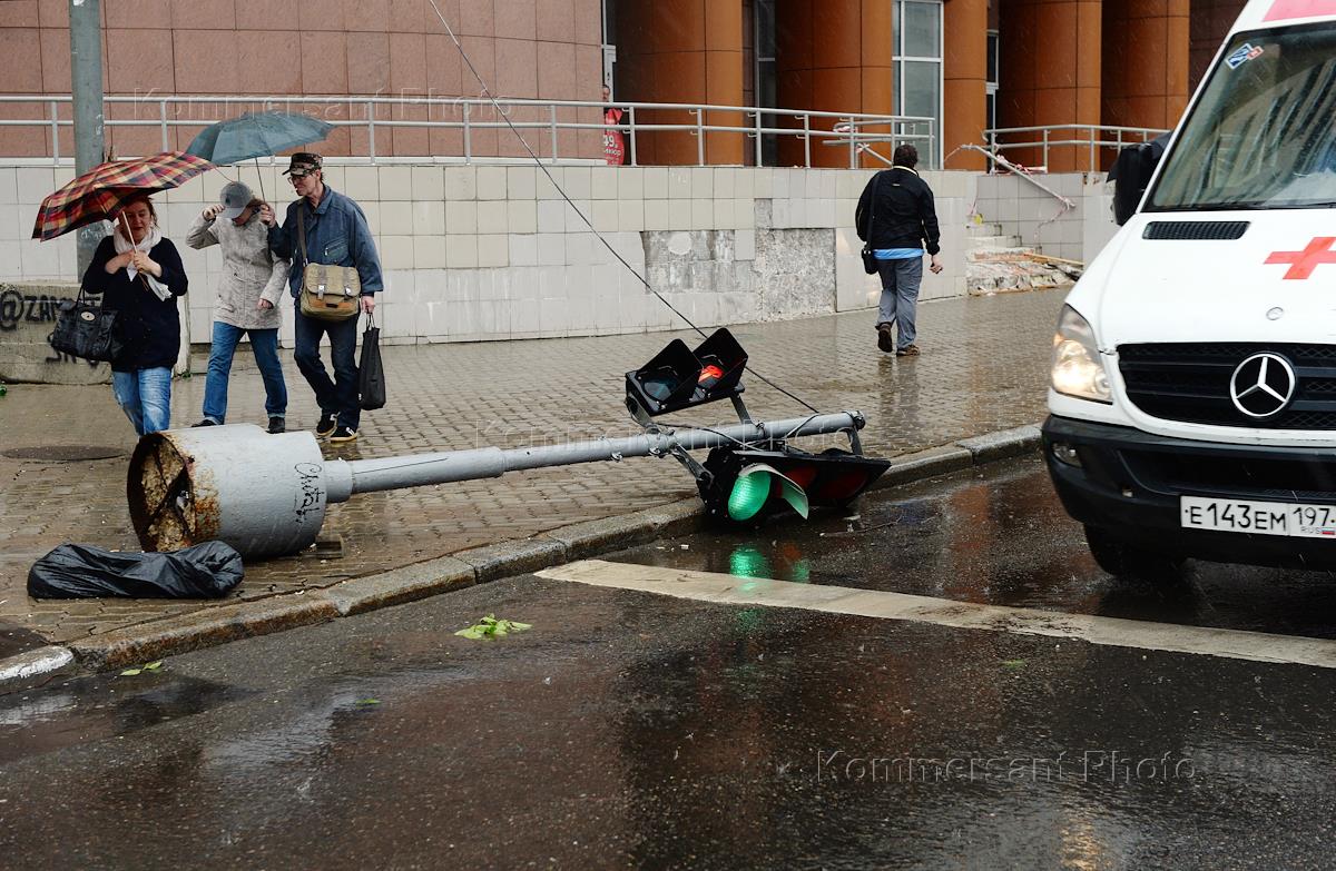 Последствия грозы и сильного ветра в Москве. Упавший светофор на тротуаре.