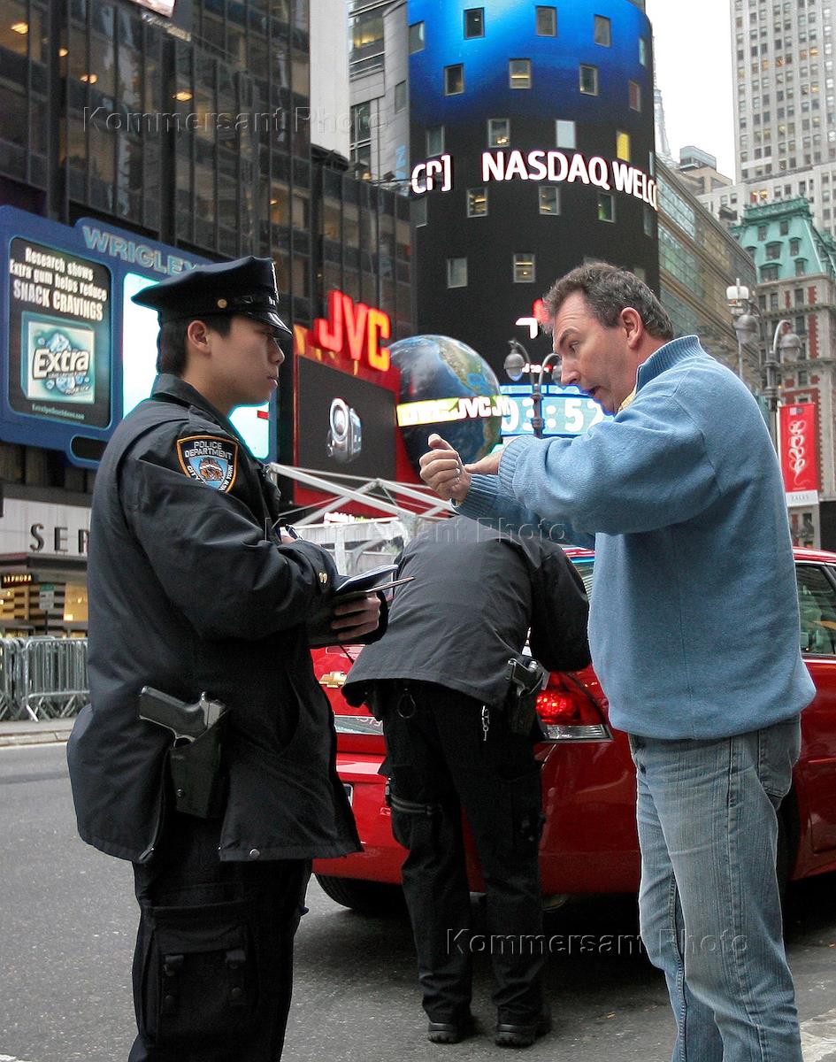 Жанровая фотография. Мужчина разговаривает с полицейским на Таймс Сквер.