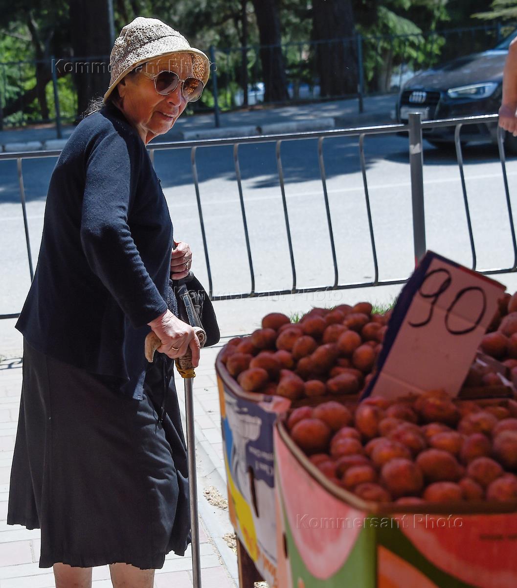 Жанровая фотография. Пожилая женщина на городском рынке у лотка с молодым картофелем.