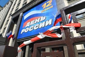 Виды Москвы. Праздничный плакат "12 июня. День России" на фасаде здания Государственной думы России.