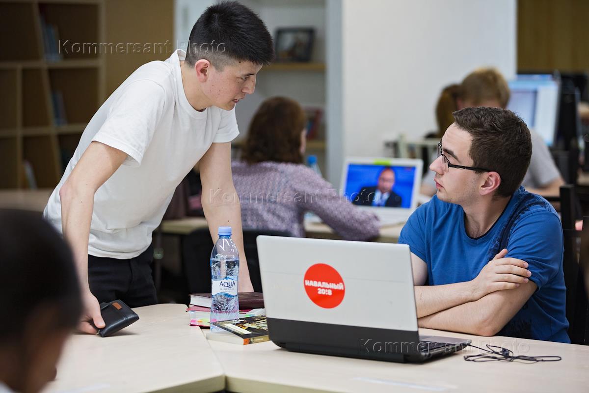 Посетители библиотеки Томского государственного университета смотрят прямую линию с Президентом РФ Владимиром Путиным.