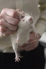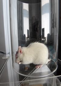 Жанровая фотография. Белая лабораторная крыса на столе в лаборатории структуры и функции митохондрий…