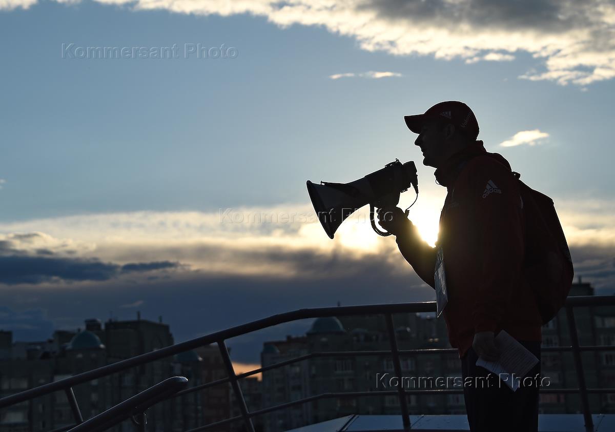 Жанровая фотография. Мужчина с мегафоном (громкоговорителем рупорным).