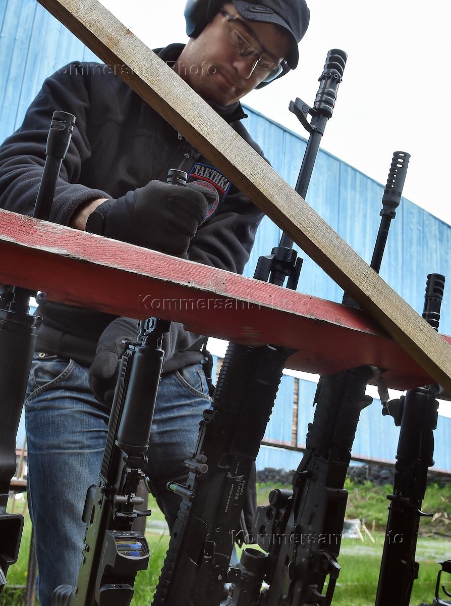 Стрелковый клуб "Тактика". Учащийся перед стойкой с оружием во время выездной тренировки.