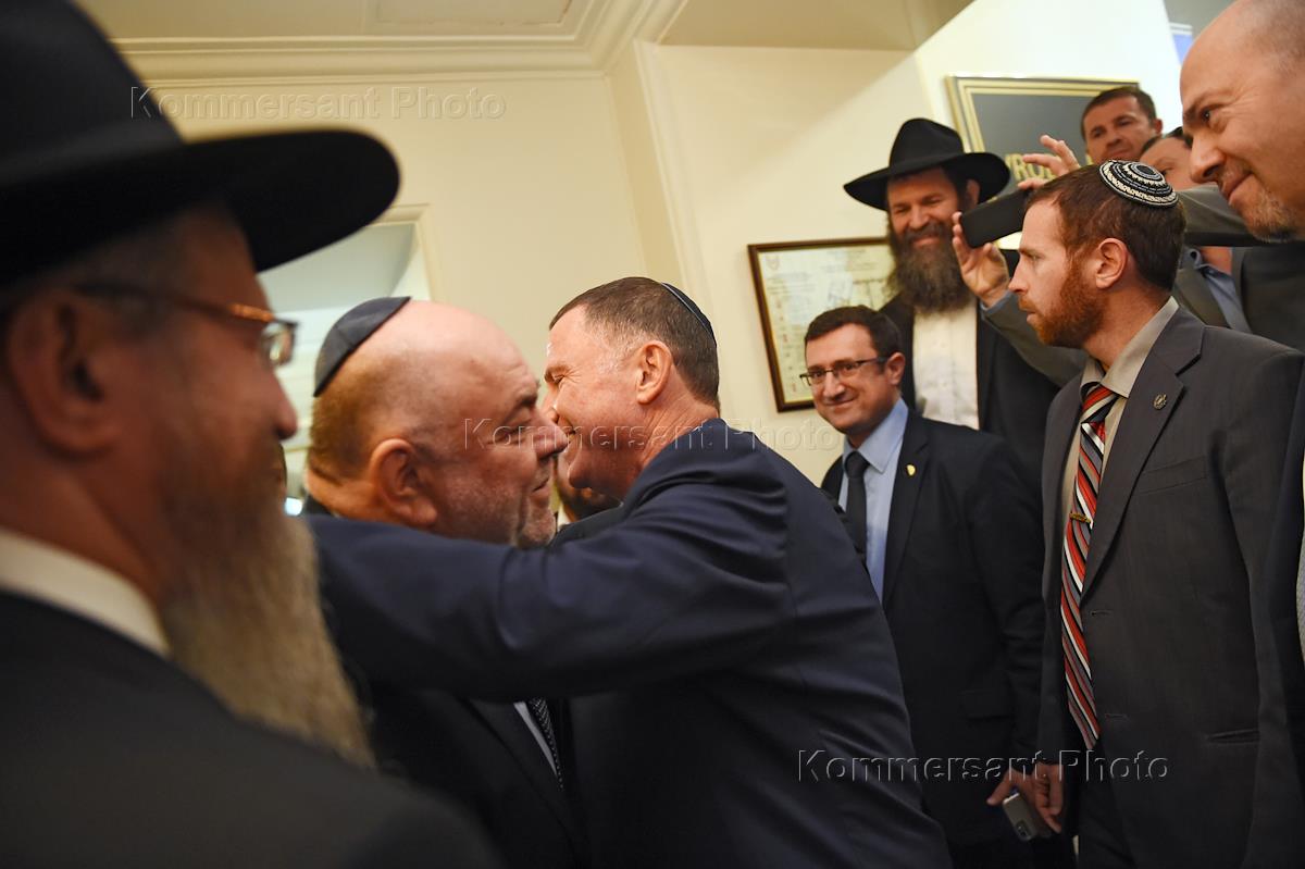 Председатель Кнессета (парламент Израиля) Юлий Эдельштейн (в центре) и главный раввин России Берл…