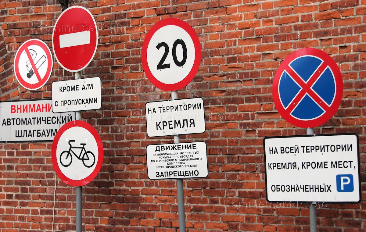 Жанровая фотография. Разнообразные дорожные знаки у въезда в Нижегородский кремль.