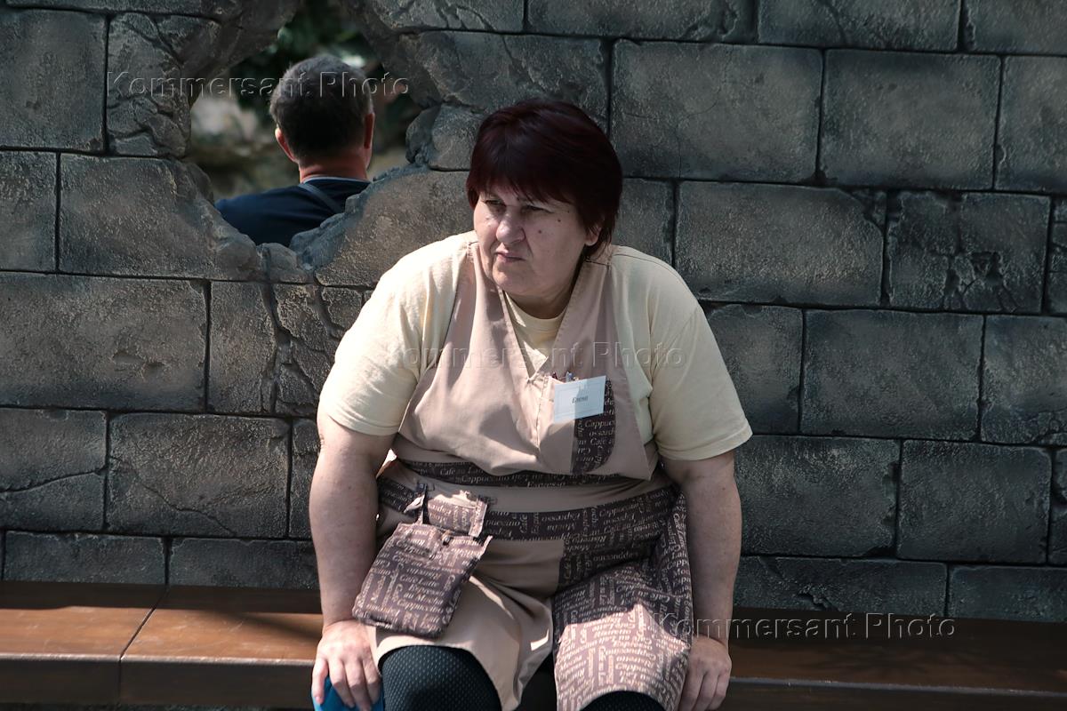 жанровая фотография. Женщина продавец отдыхает на лавочке в сквере.