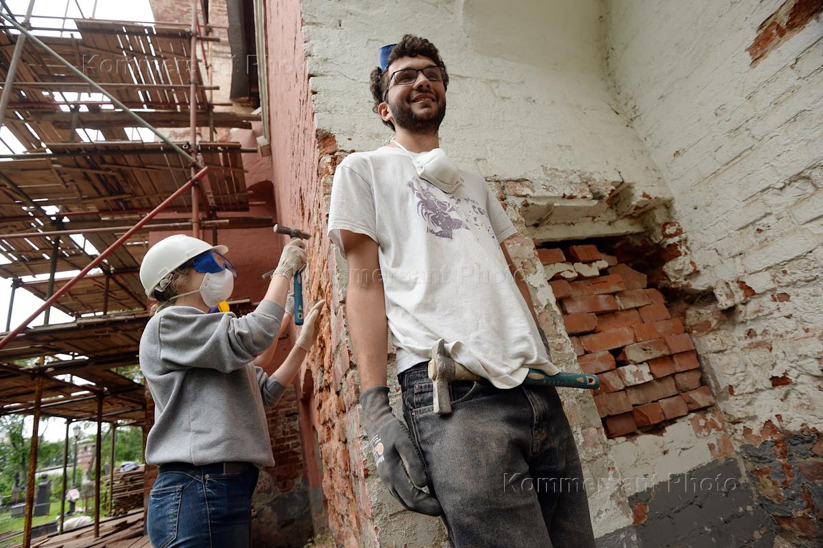 Волонтеры из Франции и России во время работ по реставрации памятников архитектуры Донского…