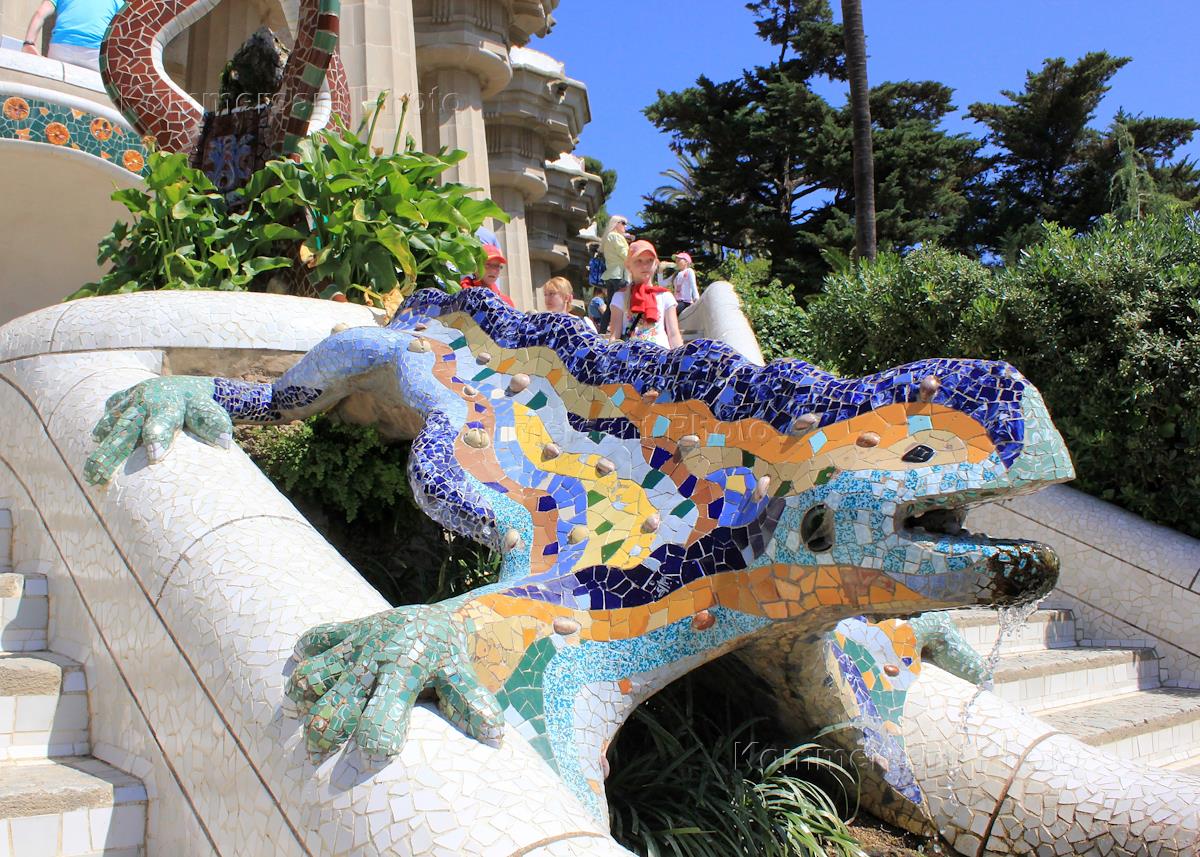 Виды Барселоны. Скульптура "Дракон" на входе в парк Гуэль, созданного архитектором Антонио Гауди в…