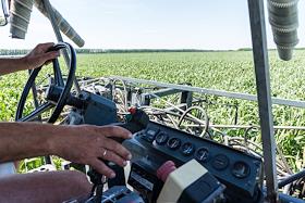 Участок гибридизации гибрида кукурузы традиционной селекции Dekalb ДКС-3203 компании "Монсанто" (Monsanto). Кастрационная машина для обрезания метелки материнских растений Hagie Detassler 204sp.