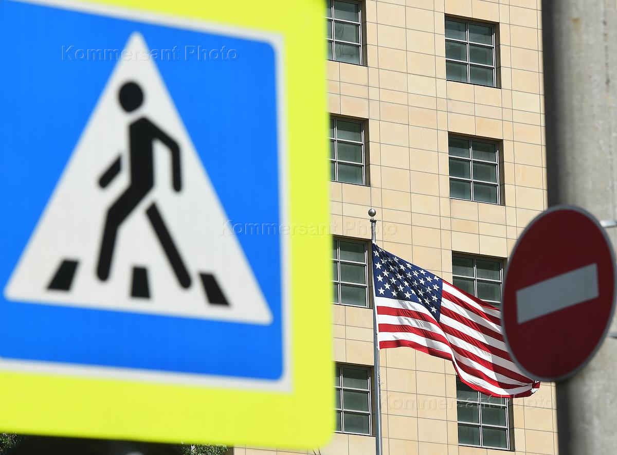 Здание Посольства США в Москве на Новинском бульваре. Информационный стенд перед зданием Посольства.