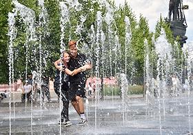 Жанровая фотография. Жара в городе. Люди купаются в фонтанах в парке "Музеон".