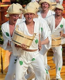 Участники церемонии открытия VI московского фестиваля пива исполняют танец с банными шайками.…