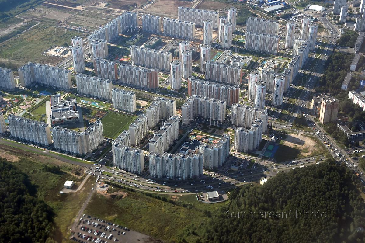 Вид города из иллюминатора самолета. Жилые многоэтажныен дома на территории Новой Москвы.
