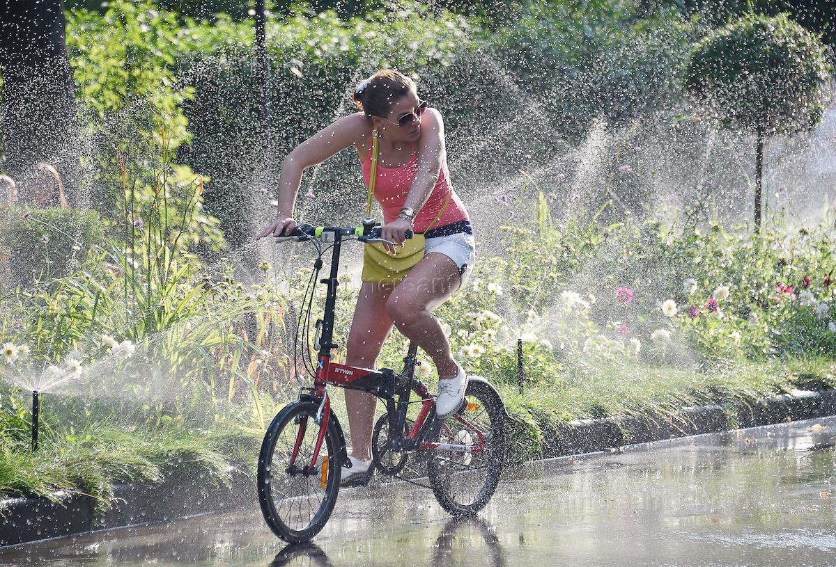 Жанровая фотография. Девушка едет на велосипеде под брызгами поливальных установок.