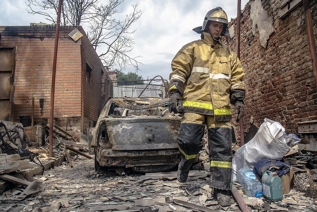 Пожарные устраняют последствия пожара в жилых домах на Грибоедовском спуске.