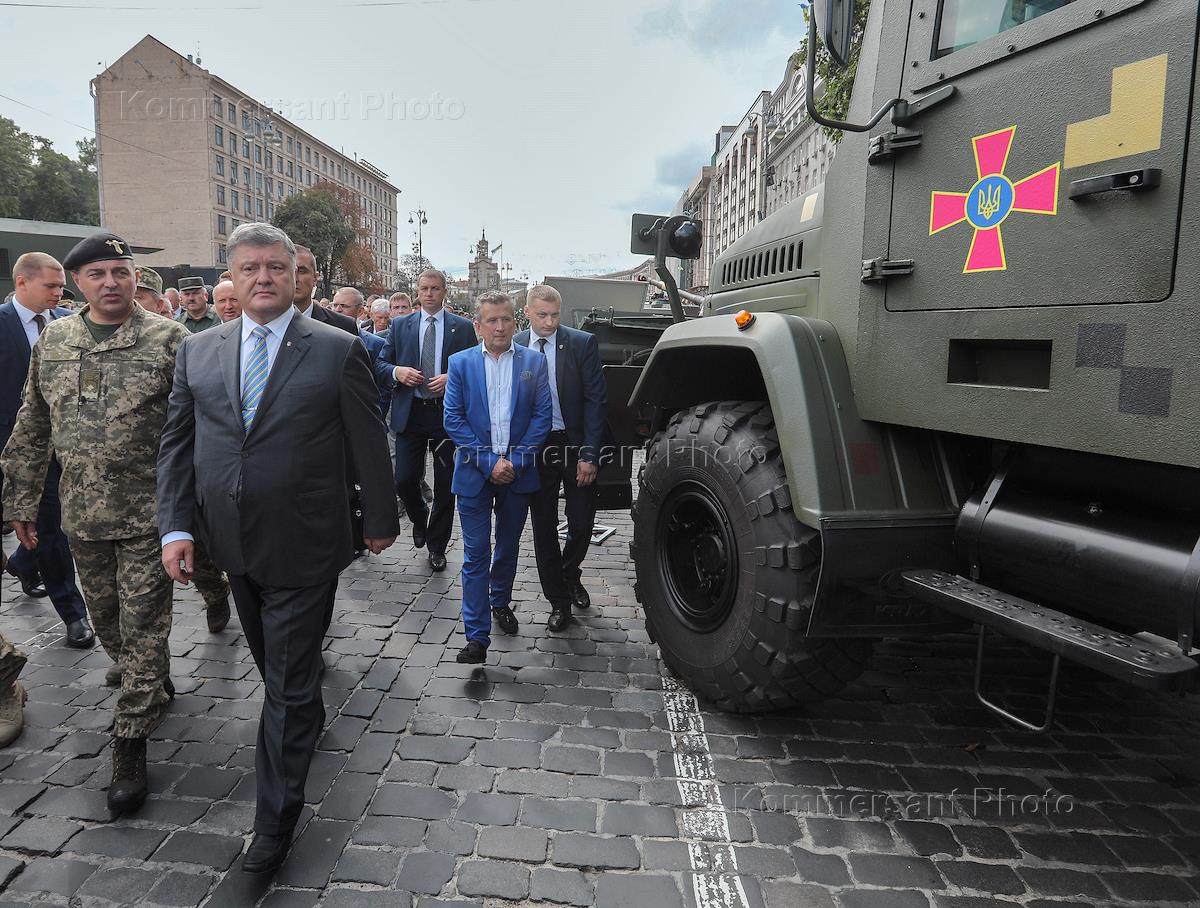 Президент Украины Петр Порошенко во время осмотра выставки вооружения и военной техники по случаю 26-й годовщины независимости Украины.