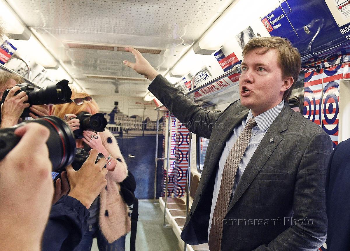 Запуск тематического поезда метро "Москва-870", посвященного 870-летию Москвы. Пассажиры в вагоне…