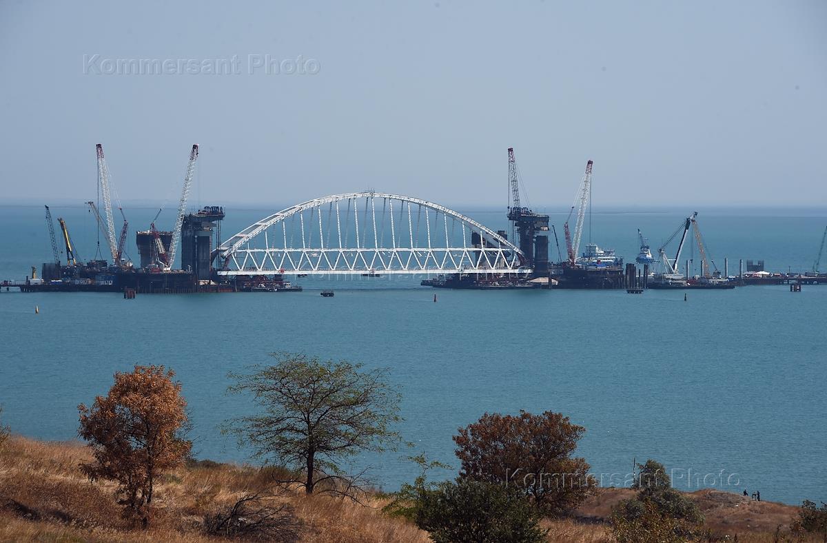 Экономика и бизнес Железнодорожная арка строящегося транспортного перехода через Керченский пролив доставлена к месту строительства моста. Установить арку планируется в течение суток.