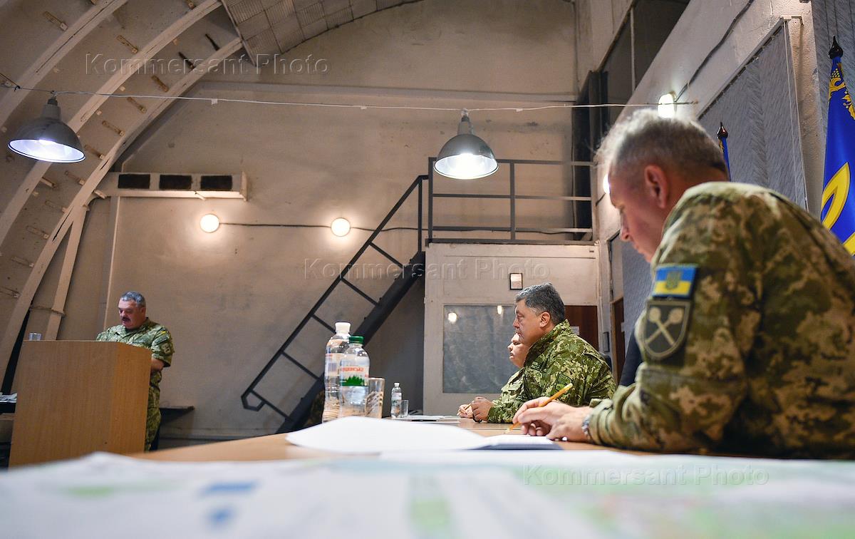 Президент Украины Петр Порошенко (второй справа) во время рабочей поездки в Краматорск Донецкой…
