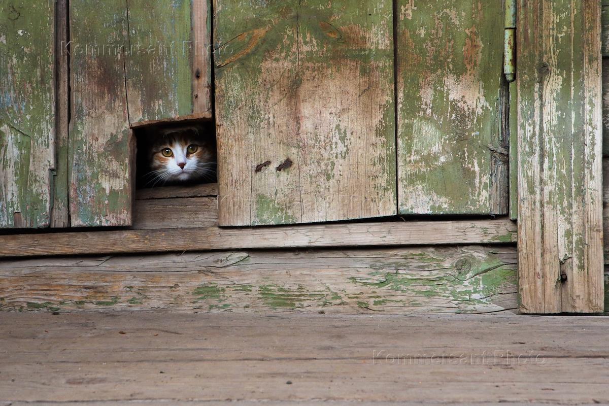 Жанровая фотография. Морда кошки в отверстии двери.