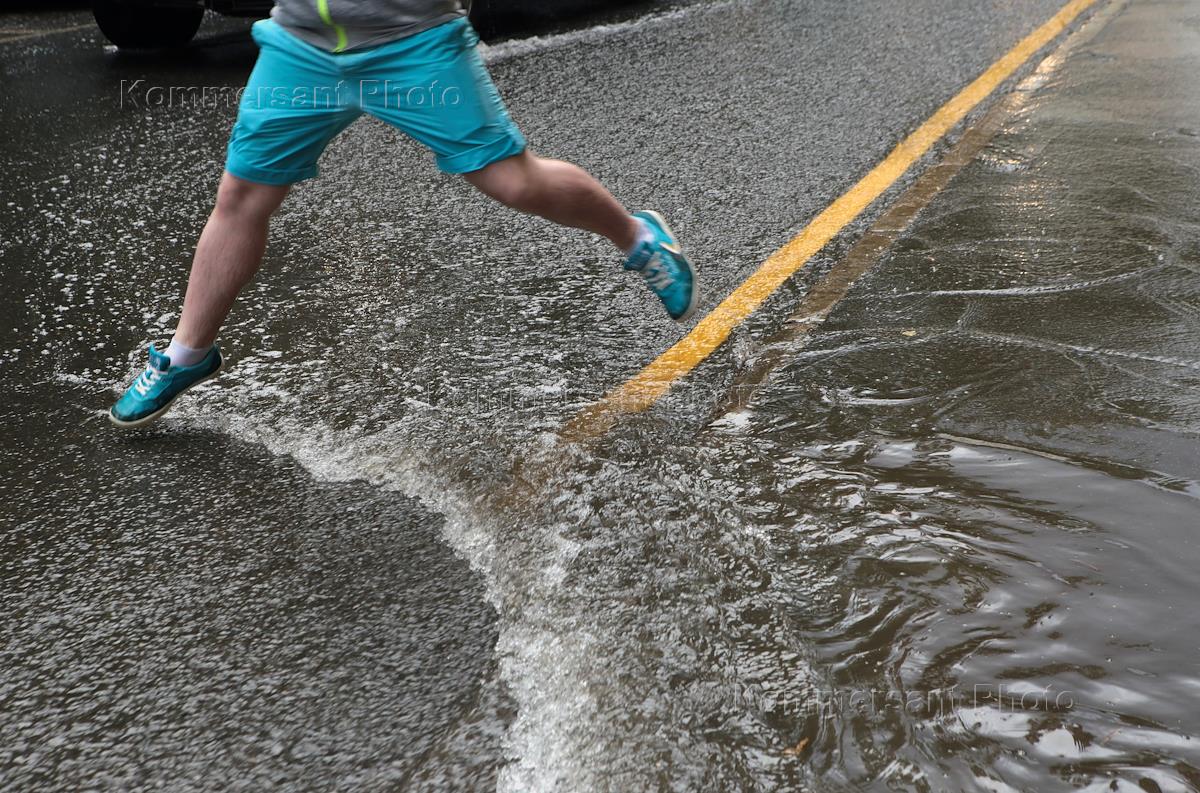 Жанровая фотография. Человек прыгает через лужу.