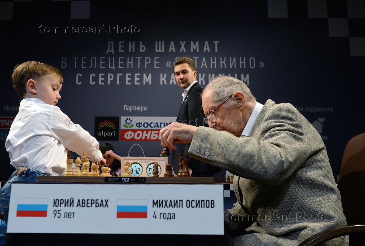Спорт Благотворительный шахматный поединок в телецентре "Останкино". Чемпион мира по быстрым шахматам Сергей Карякин провел сеанс одновременной игры с талантливыми детьми из приемных семей. Историческую партию провел старейший гроссмейстер мира Юрий Авербах и четырехлетний шахматист М.Осипов.
