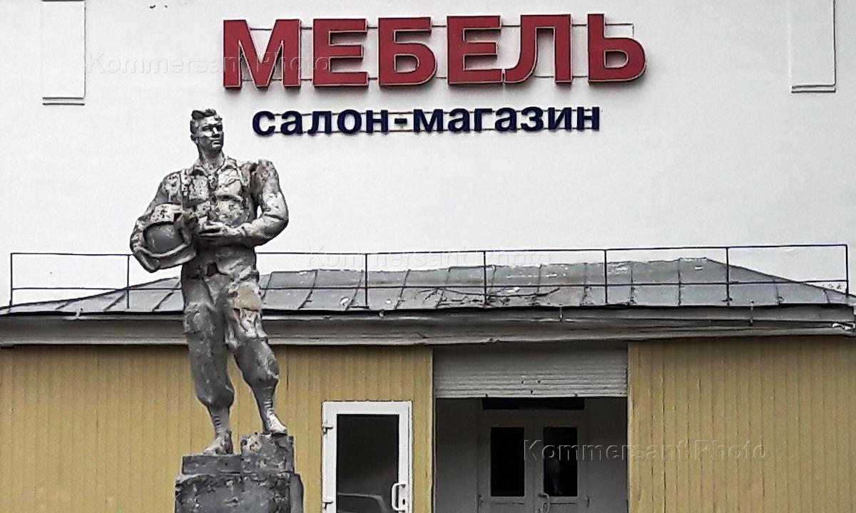 Виды города Лысково. Скульптура советского лётчика на фоне вывески магазина "Мебель".