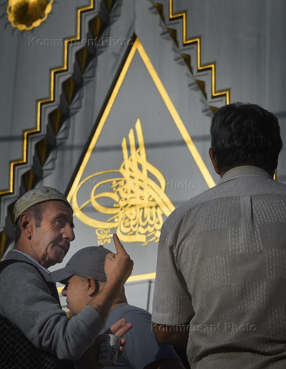 Праздник жертвоприношения Курбан-Байрам в Крыму. Верующие у мечети в Бахчисарае.