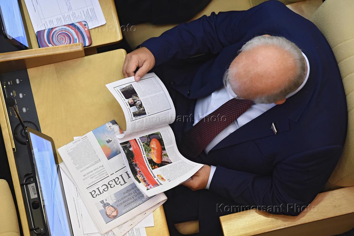 Пленарное заседание Государственной думы (ГД) России. Жанровая фотография. Депутат читает прессу.