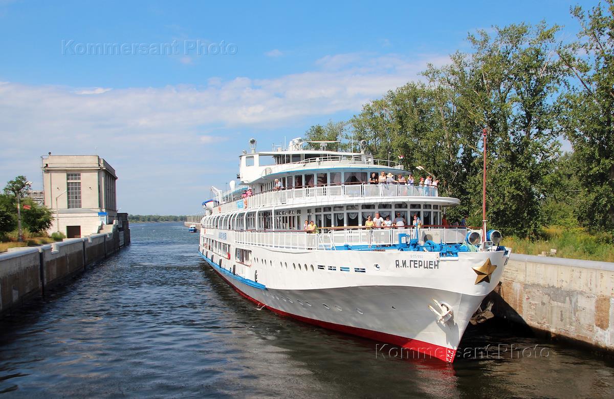 Река Волга. Куйбышевский (Самарский) гидроузел. Теплоход "А.И.Герцен" проходит шлюз.