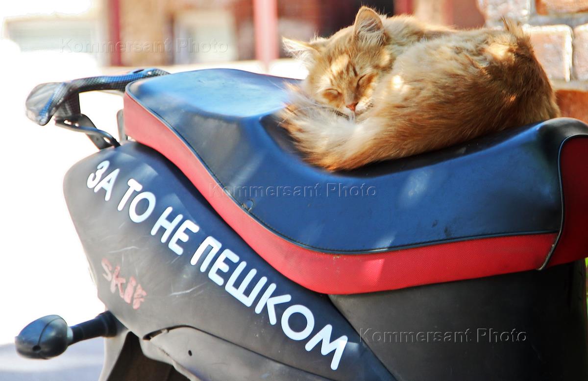 Жанровая фотография. Кошки отдыхают на припаркованном мотоцикле.