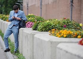 Жанровая фотография. Молодой человек с мобильным телефоном у клумб с цветами.