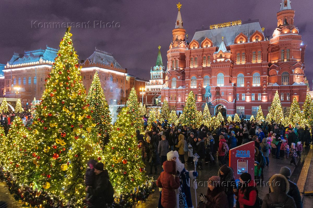 Виды Москвы. Украшение города к новому году. Новогодние елки на Манежной площади.
