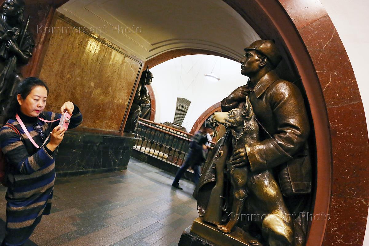 Жанровая фотография. Пассажиры на станции метро "Площадь революции" гладят морду собаки из…