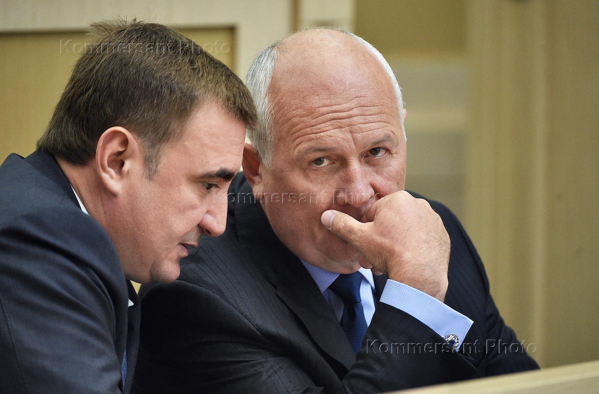Пленарное заседание Совета Федерации (СФ) России. Губернатор Тульской области Алексей Дюмин (слева)…