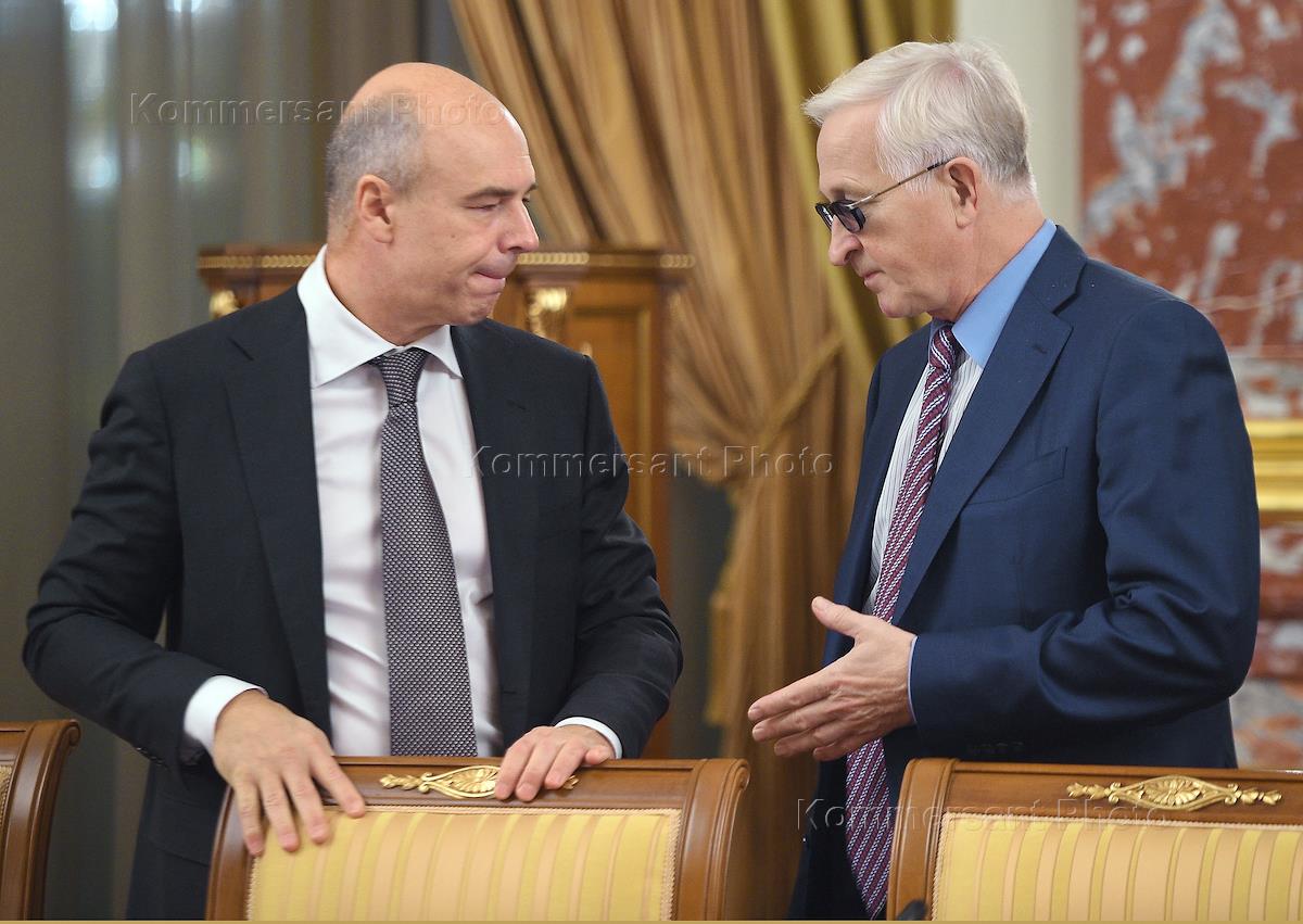 Заседание правительства России. Министр финансов России Антон Силуанов (слева) и президент…