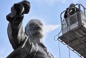 Жанровая фотогарфия. Помывка памятника Владимиру Ленину на Московской площади Санкт-Петербурга.