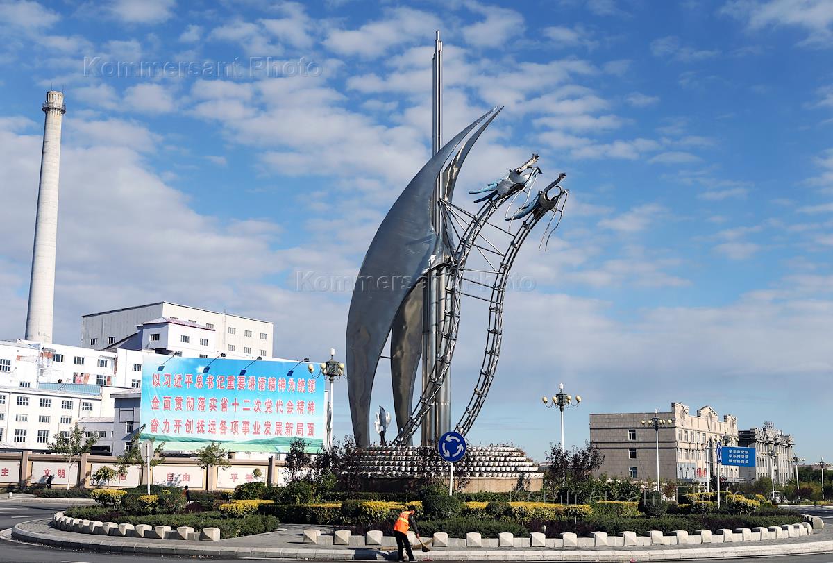 Виды города Фуюань. Жанровая фотография. Мужчина едет на мотоцикле по городу.