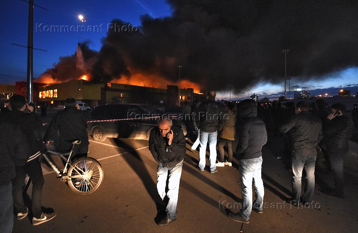 Прохожие во время пожара на строительном рынке "Синдика" на МКАД.