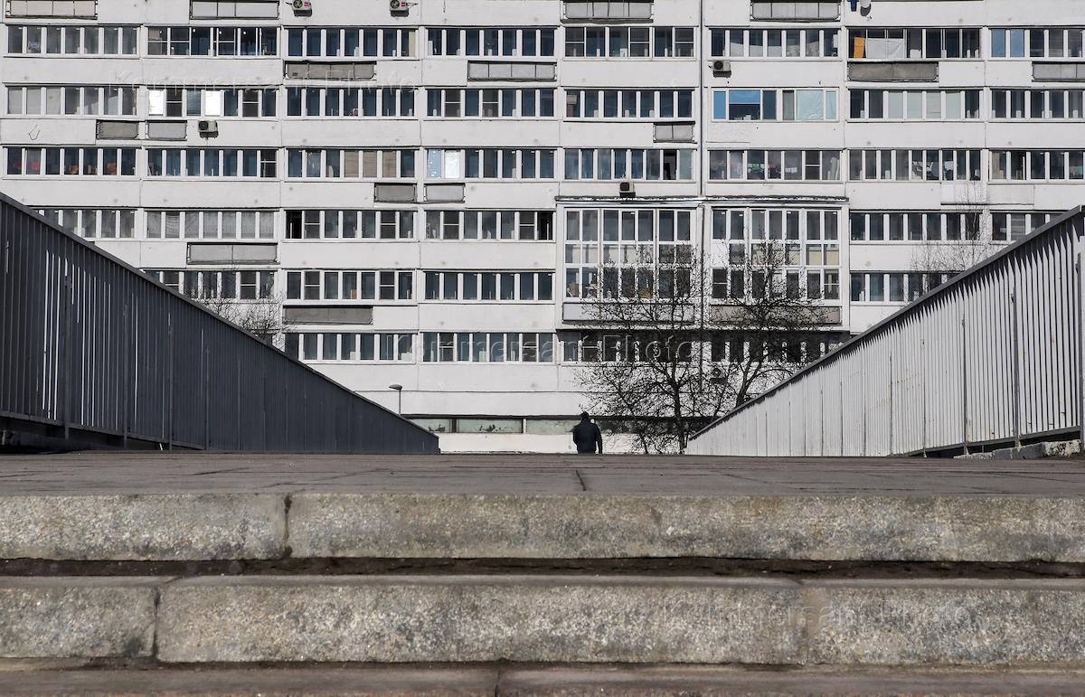Виды Зеленограда. Рекламные плакаты о аренде и продаже офисов на фасаде офисного здания.