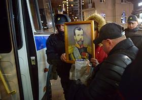 Противники показа фильма "Матильда" в кинотеатре "Октябрь".