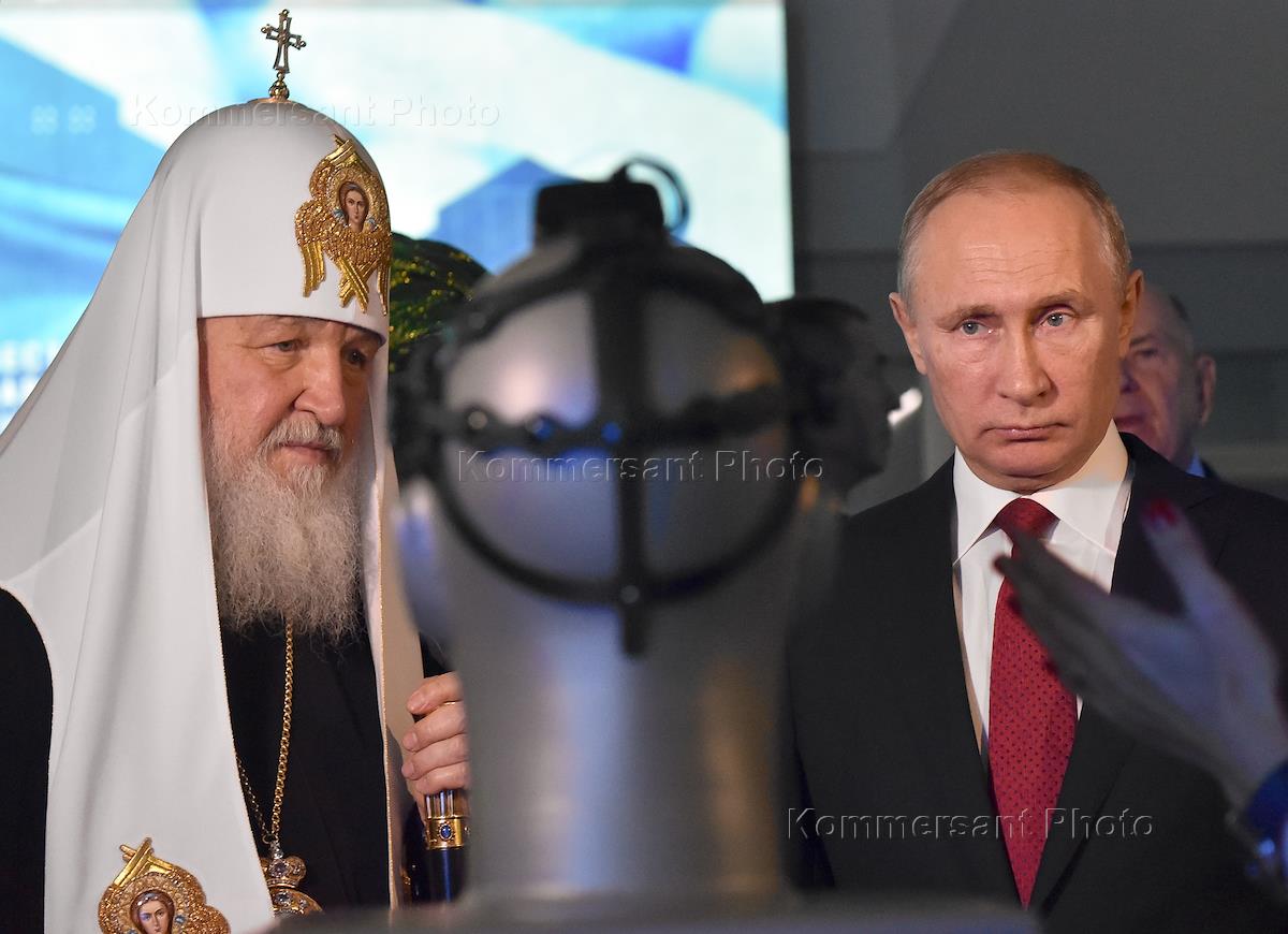 Церемония открытия выставки "Россия, устремленная в будущее" в Манеже. Президент России Владимир Путин (справа) и патриарх Московский и всея Руси Кирилл (слева) во время церемонии.