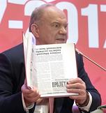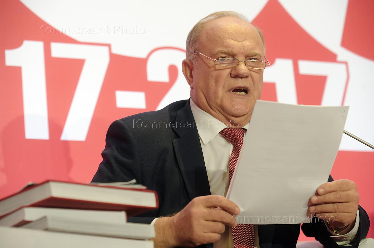 Международный форум левых сил, посвященный 100-летию Великой Октябрьской социалистической революции, прошел в гостинице "Ренессанс Москва". Лидер Коммунистической партии России Геннадий Зюганов во время церемонии открытия форума.