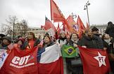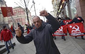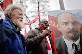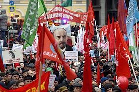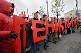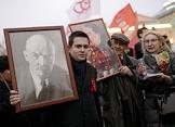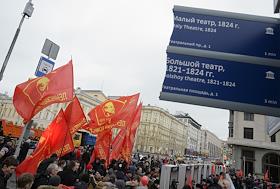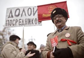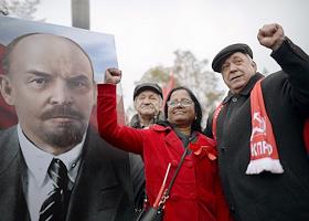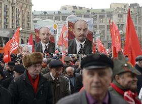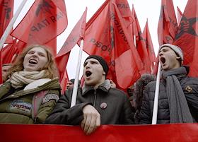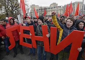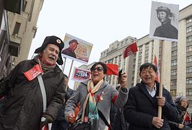 Участники праздничного шествия и митинга, посвященные 100-летию Октябрьской революции, на Театральной площади. Лидер движения "Левый фронт" Сергей Удальцов на шествии.