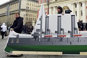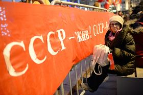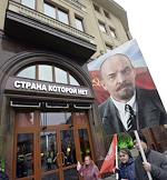 Участники праздничного шествия и митинга, посвященные 100-летию Октябрьской революции, на Охотном ряду. Вывеска "Страна которой нет".