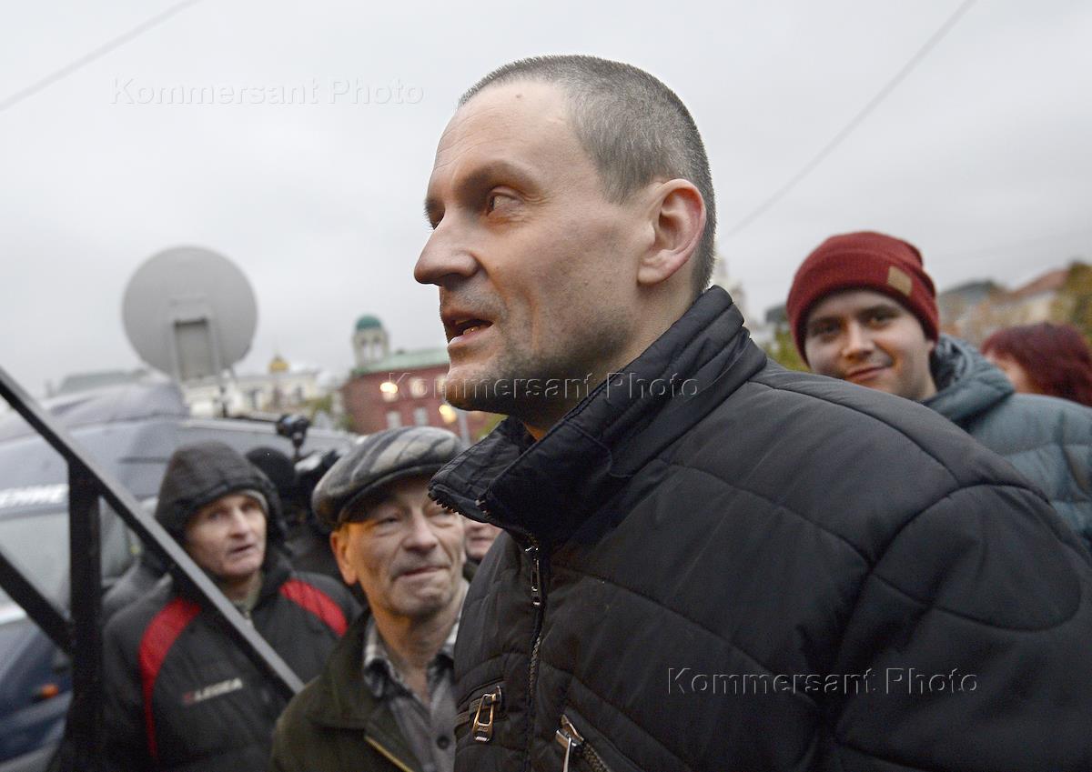 Участники праздничного шествия и митинга, посвященные 100-летию Октябрьской революции, на Театральной площади. Лидер движения "Левый фронт" Сергей Удальцов на митинге.