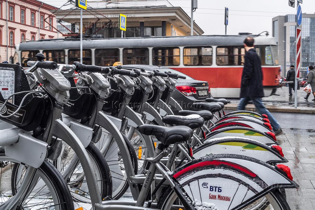 Виды Москва. Парковка московского городского велопроката на Чистопрудном бульваре.
