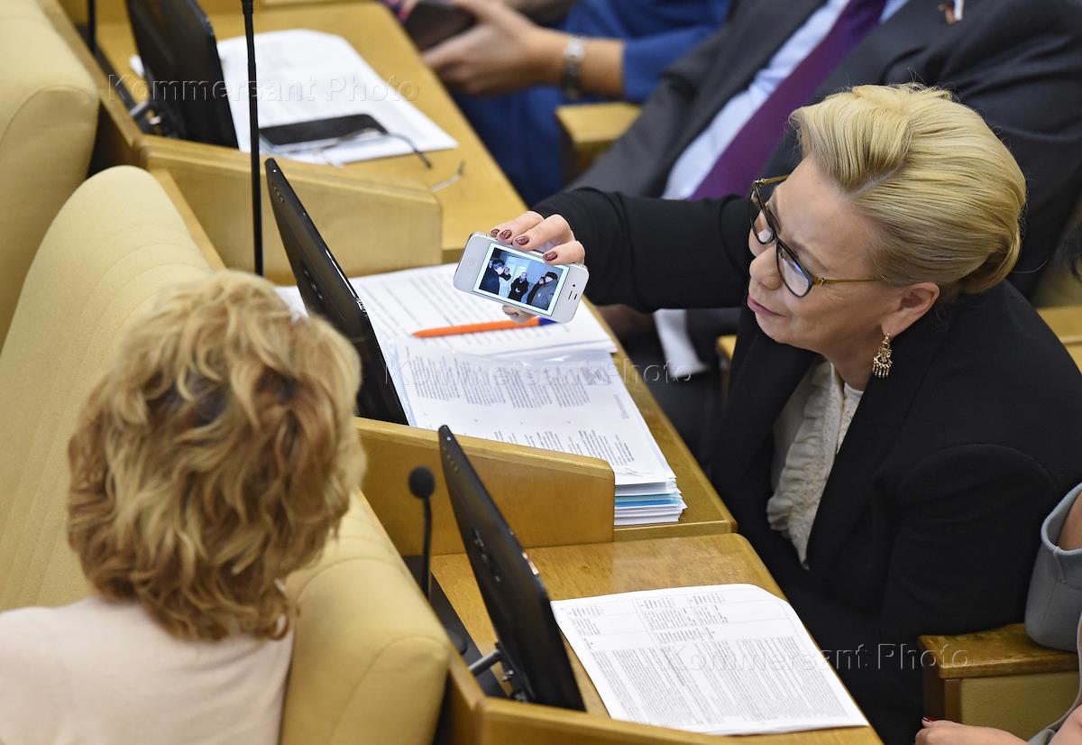Пленарное заседание Государственной думы (ГД) России. Первый заместитель председателя комитета ГД России по международным делам Светлана Журова (слева) и член комитета ГД России по государственному строительству и законодательству Ирина Белых (справа) во время заседания.