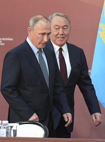 Рабочая поездка президента России Владимира Путина в Челябинск. Президент России Владимир Путин (справа) и президент Казахстана Нурсултан Назарбаев (слева) во время встречи.
